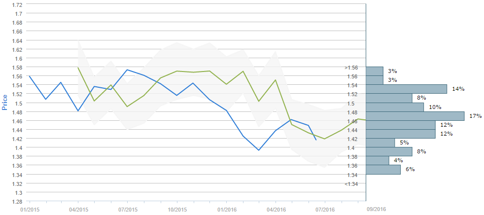 The majority of traders (55%) believe the British currency is to cost 1.46 or more dollars after a three-month period. The most popular price interval was selected by slightly less than a fifth (17%) of the voters, namely the 1.46-1.48 one, while the second most popular choice implies that the Sterling is to cost between 1.52 and 1.54 in three months, chosen by 14% of the surveyed. At the same time, the mean forecast for Sep 14 is 1.4605.