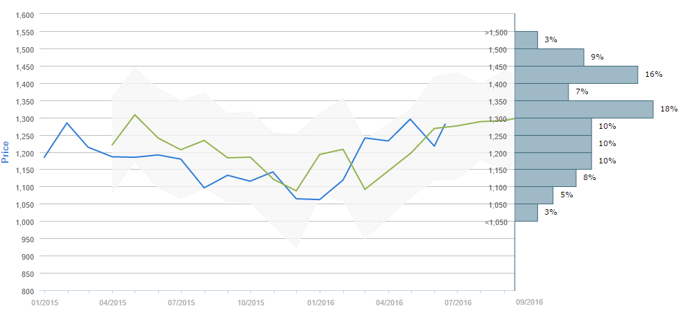 Traders who were asked regarding their longer-term views on gold between May 14 and June 14 expect, on average, to see the metal around 1,275 by the end of August. Generally, 63% (+5%) of participants believe the price will be generally above 1,250 in ninety days. Alongside, 28% (-1%) of those surveyed reckon the price will trade in the range between 1,100 and 1,250 over the next three months