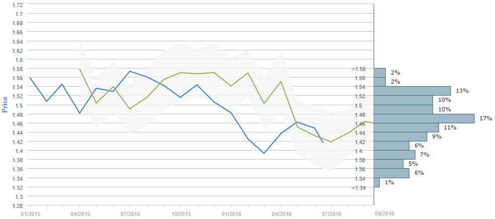 The majority of traders (54%) believe the British currency is to cost 1.46 or more dollars after a three-month period. The most popular price interval was selected by slightly less than a fifth (17%) of the voters, namely the 1.46-1.48 one, while the second most popular choice implies that the Sterling is to cost between 1.52 and 1.54 in three months, chosen by 13% of the surveyed. At the same time, the mean forecast for Sep 15 is 1.4593.