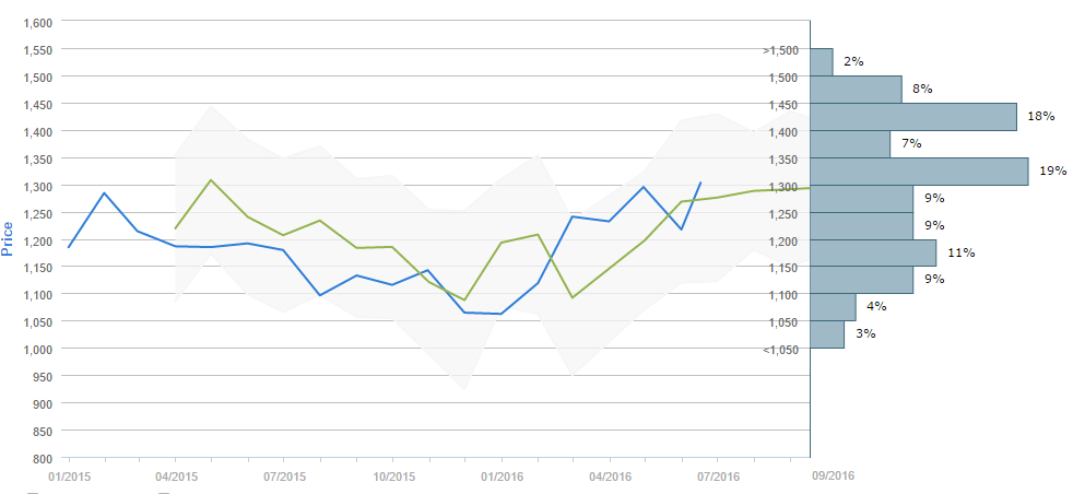 Traders who were asked regarding their longer-term views on gold between May 16 and June 16 expect, on average, to see the metal around 1,275 by the end of August. Generally, 63% (-1%) of participants believe the price will be generally above 1,250 in ninety days. Alongside, 29% (+1%) of those surveyed reckon the price will trade in the range between 1,100 and 1,250 over the next three months