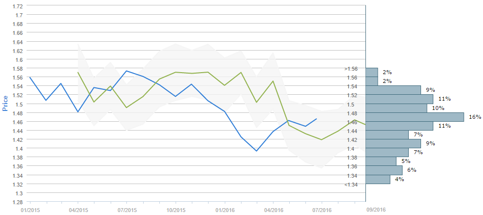 Exactly half of traders (50%) believe the British currency is to cost 1.46 or more dollars after a three-month period. The most popular price interval was selected by slightly less than a fifth (16%) of the voters, namely the 1.46-1.48 one, while the second most popular choice implies that the Sterling is to cost either between 1.44 and 1.46 dollars or between 1.52 and 1.54 dollars in three months, both chosen by 11% of the surveyed. At the same time, the mean forecast for Sep 20 is 1.4522.