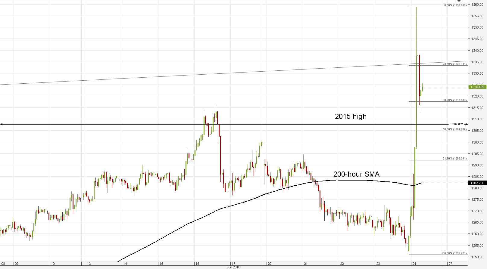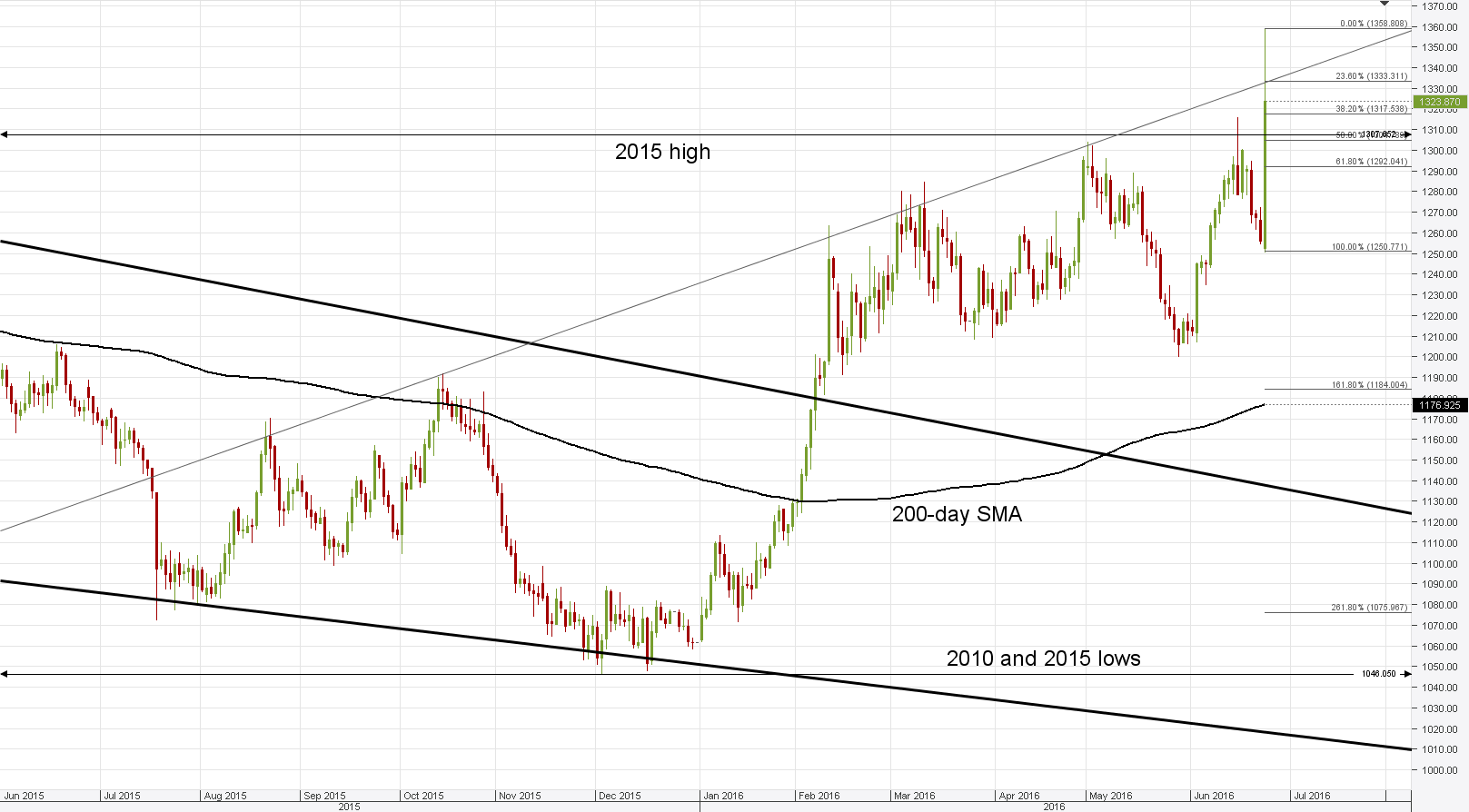 Gold spiked more than 100 dollars from the 100-day SMA at 1,250 amid the news from the UK, but the rally appears to have been stopped by the rising resistance trend-line. The trend-line has been able to contain rallies since last year's August, and is seen capable of halting today's advancement as well. Accordingly, we expect the price to close beneath 1,330 and then to retreat to a potentially strong demand area circa 1,307, where the 2015 highs is now joined by the 50% retracement of today's surge.Daily chart