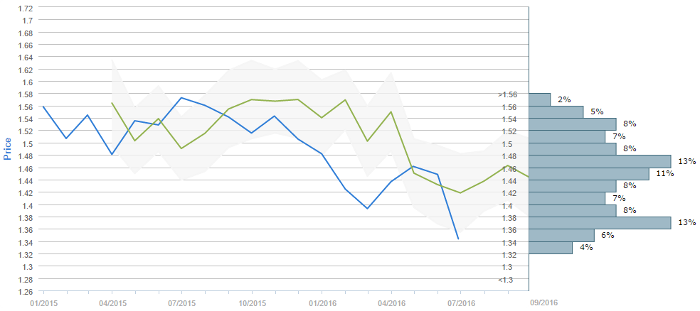 Exactly half of traders (57%) believe the British currency is to cost 1.46 or less dollars after a three-month period. The most popular price intervals were selected by slightly less than a fifth (13%) of the voters, namely the 1.46-1.48 and 1.36-1.38 ones, while the second most popular choice implies that the Sterling is to cost between 1.44 and 1.46 dollars in three months, chosen by 11% of the surveyed. At the same time, the mean forecast for Sep 27 is 1.4444.