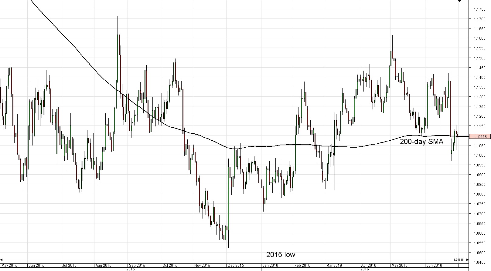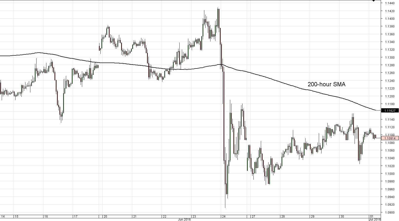 Daily chart: The European common currency experienced a three day rally against the Greenback after the Brexit vote results. However, during Thursday's trading session the pair declined slightly from 1.1124 to 1.1105 at the end of the day's session, after it was highly volatile during the time. On Friday morning, the Euro continued to depreciate against the Buck, as the currency exchange rate moved to 1.1097 by 5:00 GMT. This level is located exactly at the support provided by the 200- day SMA.Daily chart