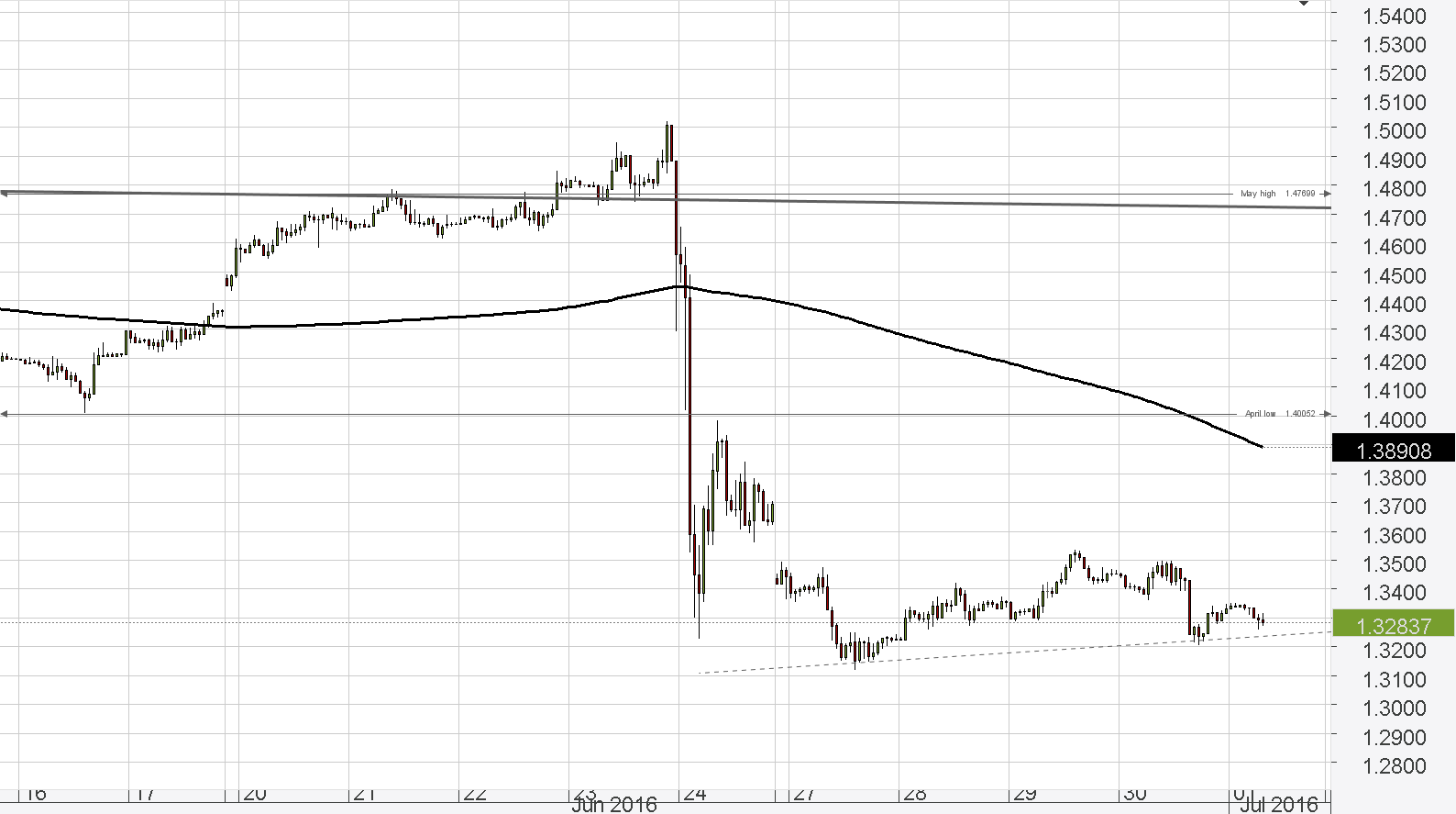 Ever since the post-referendum drop the Cable has been slowly but steadily climbing higher. Consequently, the trend-line on the hourly chart is likely to be the demand area, pushing the GBP/USD exchange rate higher, with the 200-hour SMA being the nearest resistance.
