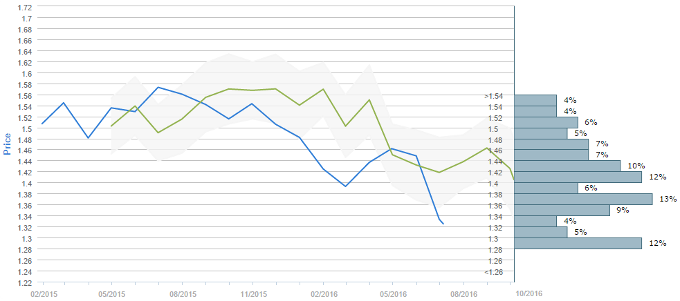 More than half of traders (51%) believe the British currency is to cost 1.40 or more dollars after a three-month period. The most popular price intervals was selected by slightly less than a fifth (13%) of the voters, namely the 1.36-1.38 one, while the second most popular choice implies that the Sterling is to cost either between 1.28 and 1.30 dollars or between 1.40 and 1.42 dollars in three months, both chosen by 12% of the surveyed. At the same time, the mean forecast for Oct 05 is 1.4052.