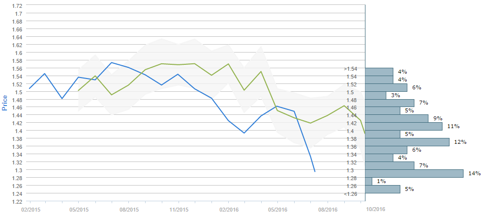More than half of traders (54%) believe the British currency is to cost 1.40 or less dollars after a three-month period. The most popular price intervals was selected by only 14% of the voters, namely the 1.28-1.30 one, while the second most popular choice implies that the Sterling is to cost between 1.36 and 1.38 dollars in three months, chosen by 12% of the surveyed. At the same time, the mean forecast for Oct 08 is 1.3916.