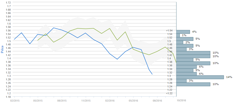 More than half of traders (59%) believe the British currency is to cost 1.40 or less dollars after a three-month period. The most popular price intervals was selected by only 14% of the voters, namely the 1.28-1.30 one, while the second most popular choice implies that the Sterling is to cost either between 1.24 and 1.26, or between 1.36 and 1.38, or 1.40 and 1.42 or even between 1.42 and 1.44 dollars in three months, all four chosen by 10% of the surveyed. At the same time, the mean forecast for Oct 12 is 1.3736.