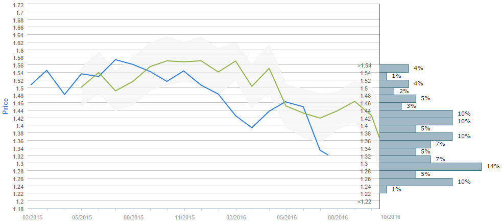 More than half of traders (64%) believe the British currency is to cost 1.40 or less dollars after a three-month period. The most popular price intervals was selected by only 14% of the voters, namely the 1.28-1.30 one, while the second most popular choice implies that the Sterling is to cost either between 1.24 and 1.26, between 1.36 and 1.38, or between 1.40 and 1.42, or even between 1.42 and 1.44 dollars in three months, all four chosen by 10% of the surveyed. At the same time, the mean forecast for Oct 14 is 1.3662.