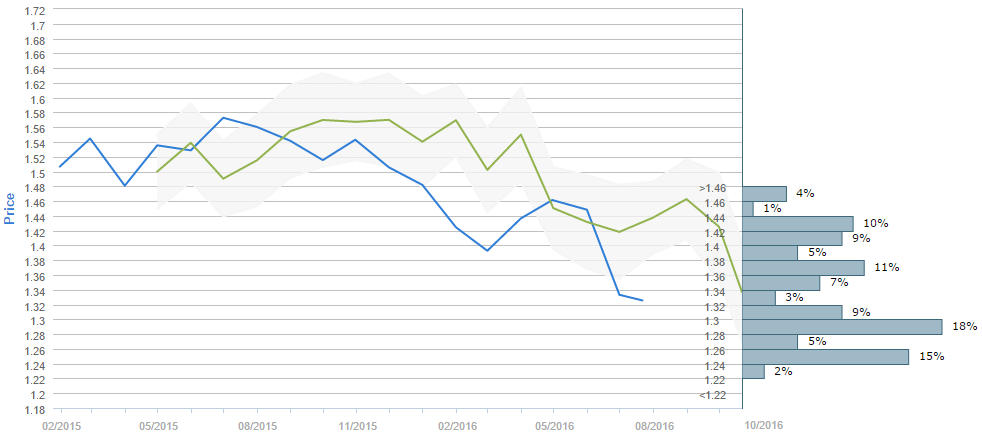 More than half of traders (59%) believe the British currency is to cost 1.36 or less dollars after a three-month period. The most popular price intervals was selected by only 18% of the voters, namely the 1.28-1.30 one, while the second most popular choice implies that the Sterling is to cost between 1.24 and 1.26 dollars in three months, chosen by 15% of the surveyed. At the same time, the mean forecast for Oct 21 is 1.3369.