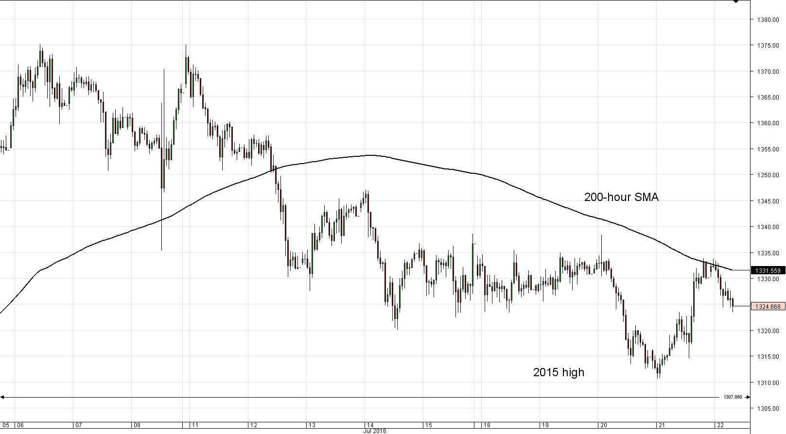 Hourly chart: The hourly chart for gold shows a steady surge for the metal from 1,311.69 at 1:00 GMT on Thursday to 1,333.18 by 20:00 GMT. At the 1,333 level the yellow metal met with the 200-hour SMA and tested it for six hours. However, gold failed to break the resistance put up by the SMA, and the metal's price fell to 1,326.10 by 6:15 GMT.
