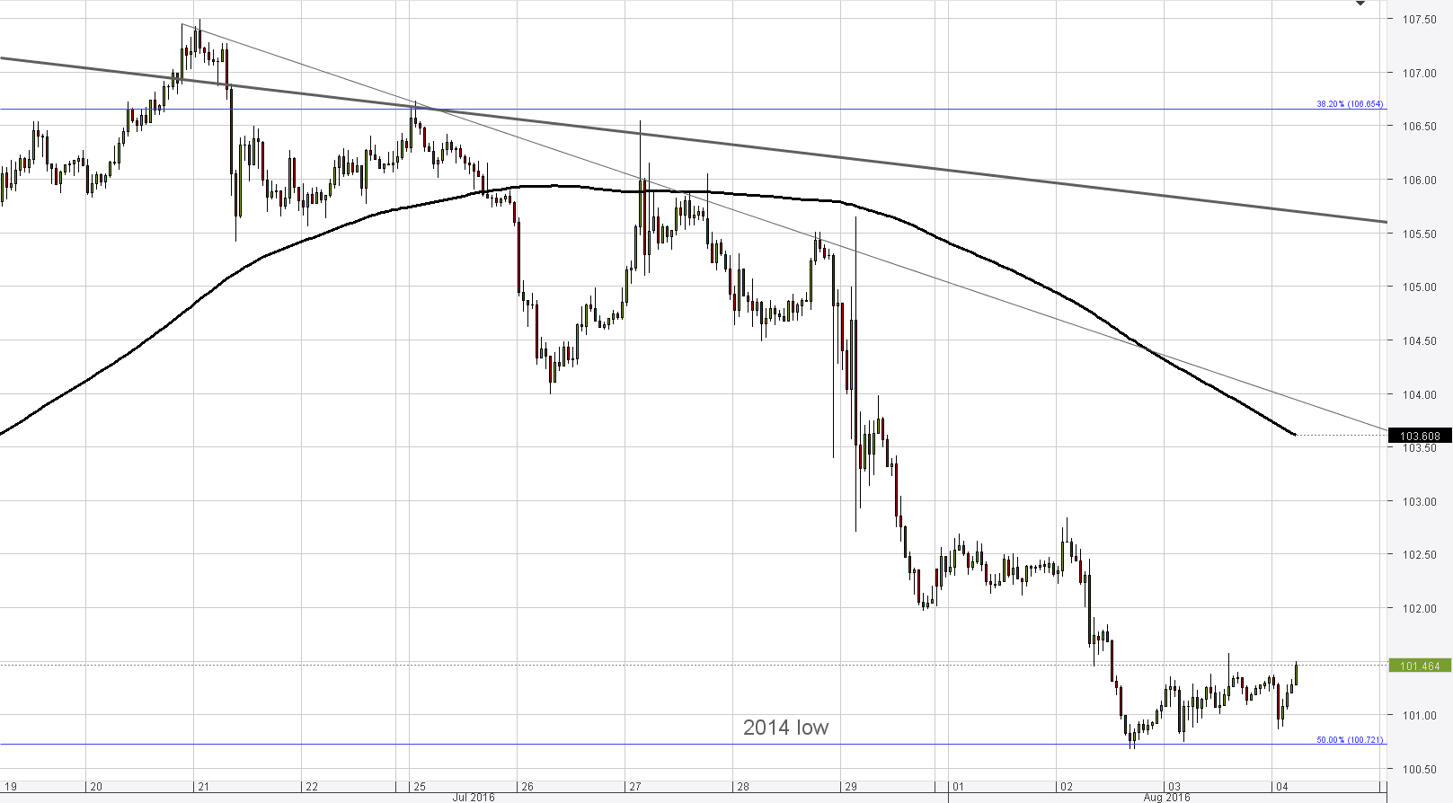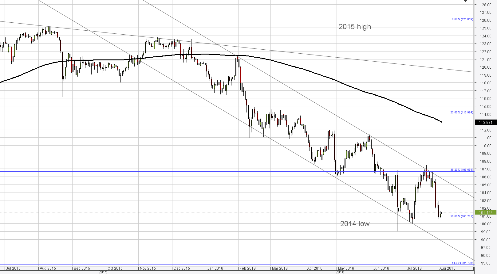 So far support at 100.70, represented by the 2014 low and 50% retracement of the 2012-2015 up-move, is able to hold off the bearish pressure. Demand in this region is also reinforced by a psychological level of 100 yen, below which we may expect interventions from the BOJ. Accordingly, the rate is well-positioned to return to the monthly PP at 103.20. Nevertheless, prolonged recovery is unlikely because of the bearish monthly indicators and a strong trend-line at 105, where resistance is strengthened by the 55-day SMA.Daily chart