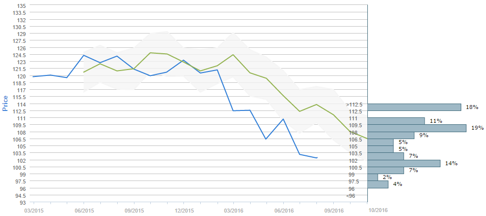 Slightly more than a half expect the exchange rate to fall below 108.00 yen