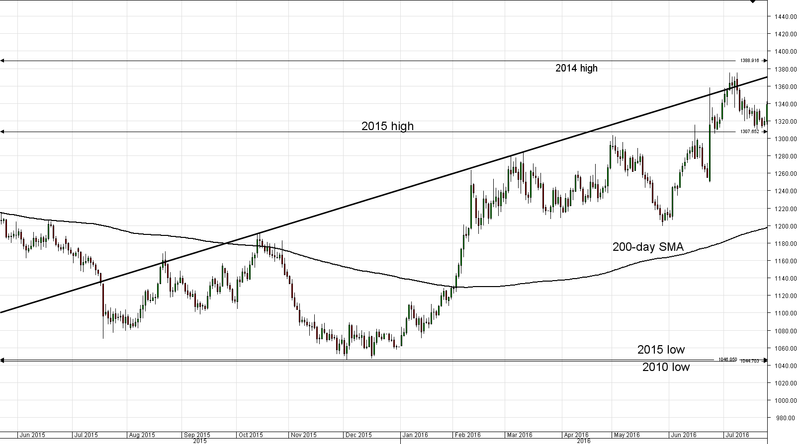 There is only one fundamental data release, which will affect the yellow metal on Thursday from the US, as its movement might be changed by data affecting the US Dollar. The US Initial Jobless Claims will be released at 12:30 GMT, and they are expected to be at 266,000. However, the post Brexit turmoil continues to plague the financial markets and drive market participants to safe currencies and gold. Most analysts expect that during today's Bank of England's meeting the BoE rate will be decreased to 0.25% from 0.5%.
