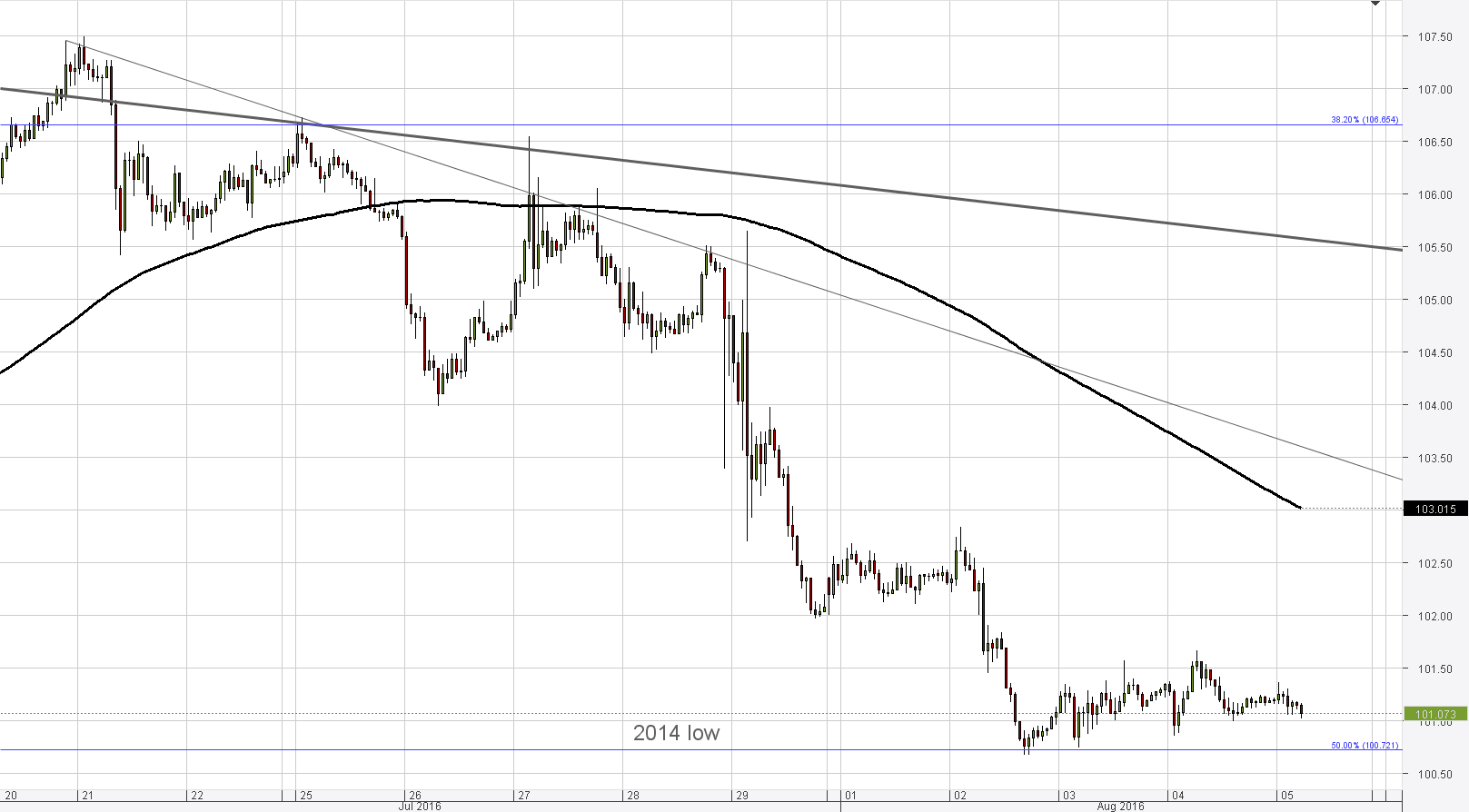 Support at 100.70 holds, meaning there is still a good chance of a rally, first up to 103 and then up to 105 yen. The former resistance is created by the monthly pivot point, while the latter a lot denser supply zone is much less likely to let the price increase further. There the bulls will encounter the six-month down-trend and the 55-day SMA. Alternatively, if the scenario suggested by the indicators materialises and both 100.70 and 100 fall victim to the selling pressure, we will expect a bullish correction to start only circa 97 yen, when the rate meets the lower bound of the bearish channel.Daily chart