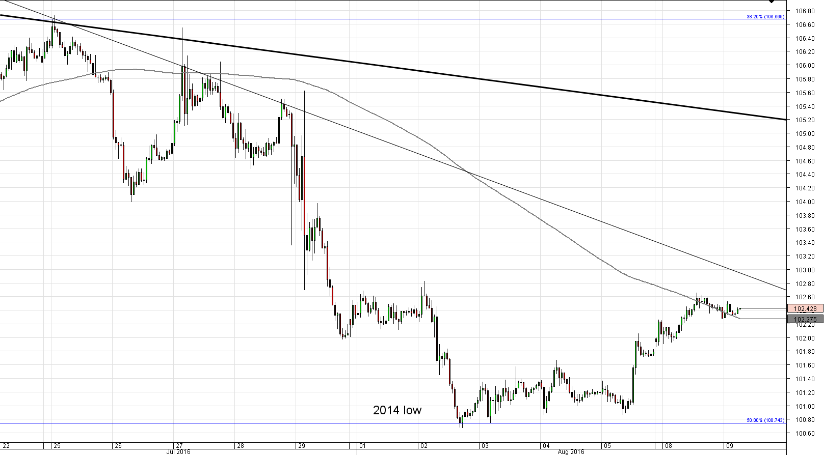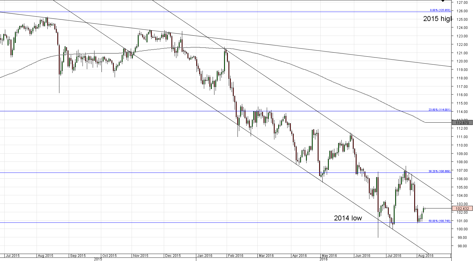 The recent rebound from the 50% Fibo keeps suggesting that a short-term recovery towards the current descending channel's resistance line is likely to take place. On the other hand, daily technical indicators imply the USD/JPY currency pair is to sustain a loss today, with the weekly PP at 101.76 acting as the immediate support. In any case, the overall outlook is to remain bearish, as long as the key resistance remains intact, meaning that the current recovery might be short-lived. However, it is uncertain whether bears will be able to push the exchange rate significantly below the support area of 100.70.Daily chart