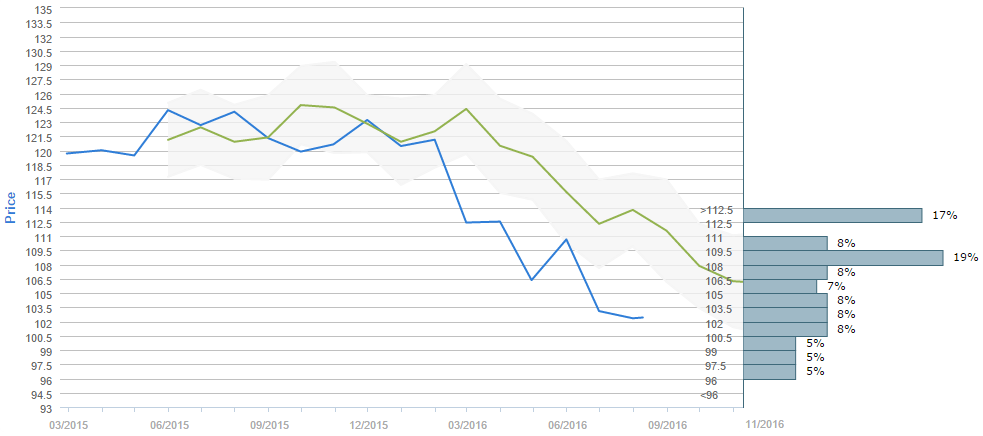 Slightly more than a half expect the exchange rate to fall below 108.00 yen