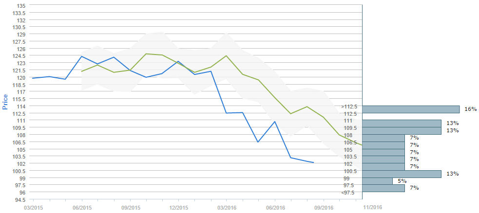 Slightly more than a half expect the exchange rate to fall below 108.00 yen