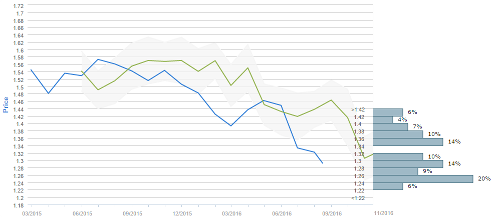 Slightly more than half of traders (51%) believe the British currency is to cost 1.30 or more dollars after a three-month period. The most popular price interval, however, was selected by 20% of the voters, namely the 1.24-1.26, while the second most popular choices imply that the Sterling is to cost either between 1.28 and 1.30 dollars or between 1.34 and 1.36 dollars in three months, both chosen by 14% of the surveyed. At the same time, the mean forecast for Nov 15 is 1.3157.