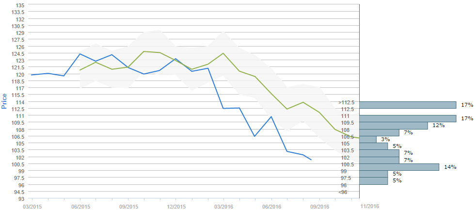 Slightly more than a half expect the exchange rate to fall below 108.00 yen