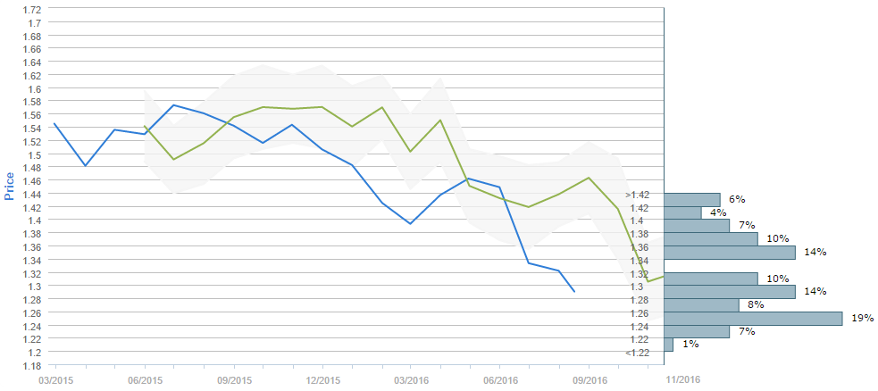 Slightly more than half of traders (51%) believe the British currency is to cost 1.30 or more dollars after a three-month period. The most popular price interval, however, was selected by 19% of the voters, namely the 1.24-1.26, while the second most popular choices imply that the Sterling is to cost either between 1.28 and 1.30 dollars or between 1.34 and 1.36 dollars in three months, both chosen by 14% of the surveyed. At the same time, the mean forecast for Nov 16 is 1.3131.
