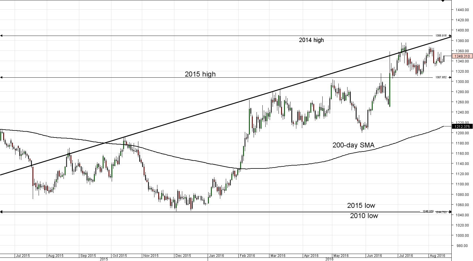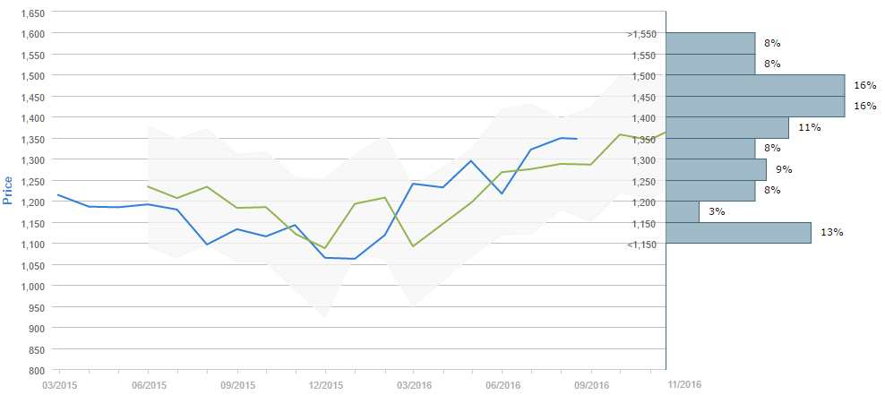Traders who were asked regarding their longer-term views on gold between July 16 and August 16 expect, on average, to see the metal around 1,375 by the end of October. Generally, 48% of participants believe the price will be above 1,400 in ninety days. Alongside, 36% (-2%) of those surveyed reckon the price will trade in the range between 1,200 and 1,400 over the next three months