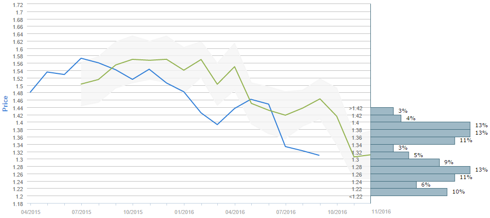 Slightly more than half of traders (52%) believe the British currency is to cost 1.30 or more dollars after a three-month period. The most popular price interval, however, was divided between three price intervals, namely the 1.26-1.28, 1.36-1.38 and 1.38-1.40, each selected by 13% of the voters. The second most popular choices imply that the Sterling is to cost either between 1.24 and 1.26 dollars, or between 1.34 and 1.36 dollars in three months, both chosen by 11% of the surveyed. At the same time, the mean forecast for Nov 29 is 1.3108.