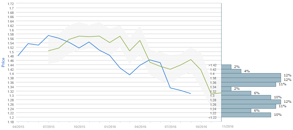 Slightly more than half of traders (51%) believe the British currency is to cost 1.30 or more dollars after a three-month period. The most popular price interval, however, was divided between three price intervals, namely the 1.26-1.28, 1.36-1.38 and 1.38-1.40, each selected by 12% of the voters. The second most popular choices imply that the Sterling is to cost either between 1.24 and 1.26 dollars, or between 1.34 and 1.36 dollars in three months, both chosen by 11% of the surveyed. At the same time, the mean forecast for Nov 30 is 1.3105.