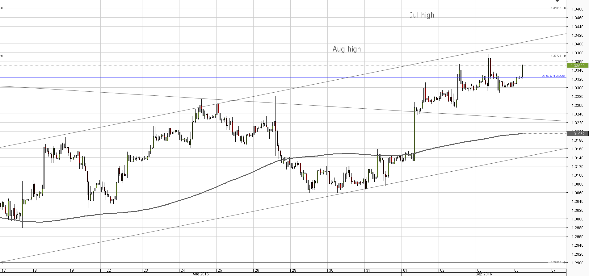 According to the latest data released by Markit Economics, Britain's services sector rebounded notably in August, showing a strong recovery from the post-Brexit plunge recorded during the previous month. Markit's Purchasing Managers Index for the services sector added 5.5 points or rising from a four-year low of 47.4 in July to 52.9 in August, easily beating expectations for a 50 reading. Moreover, the increase of 5.5 points on a monthly period was the largest jump recorded over the 20-year history of the survey and followed a record drop of 4.9 points in July. It is worth to point out that PMI report followed news on Thursday of a bigger-than-expected rebound, to a 10-month high, of the Markit manufacturing-sector PMI for the UK and like the Thursday report, it boosted the pound. The Sterling soared to a seven-week high against the dollar after data showed the UK services sector rebounded sharply in August, following a slump during the previous months. The UK currency increased 0.35% against the dollar to 1.3340 mark.