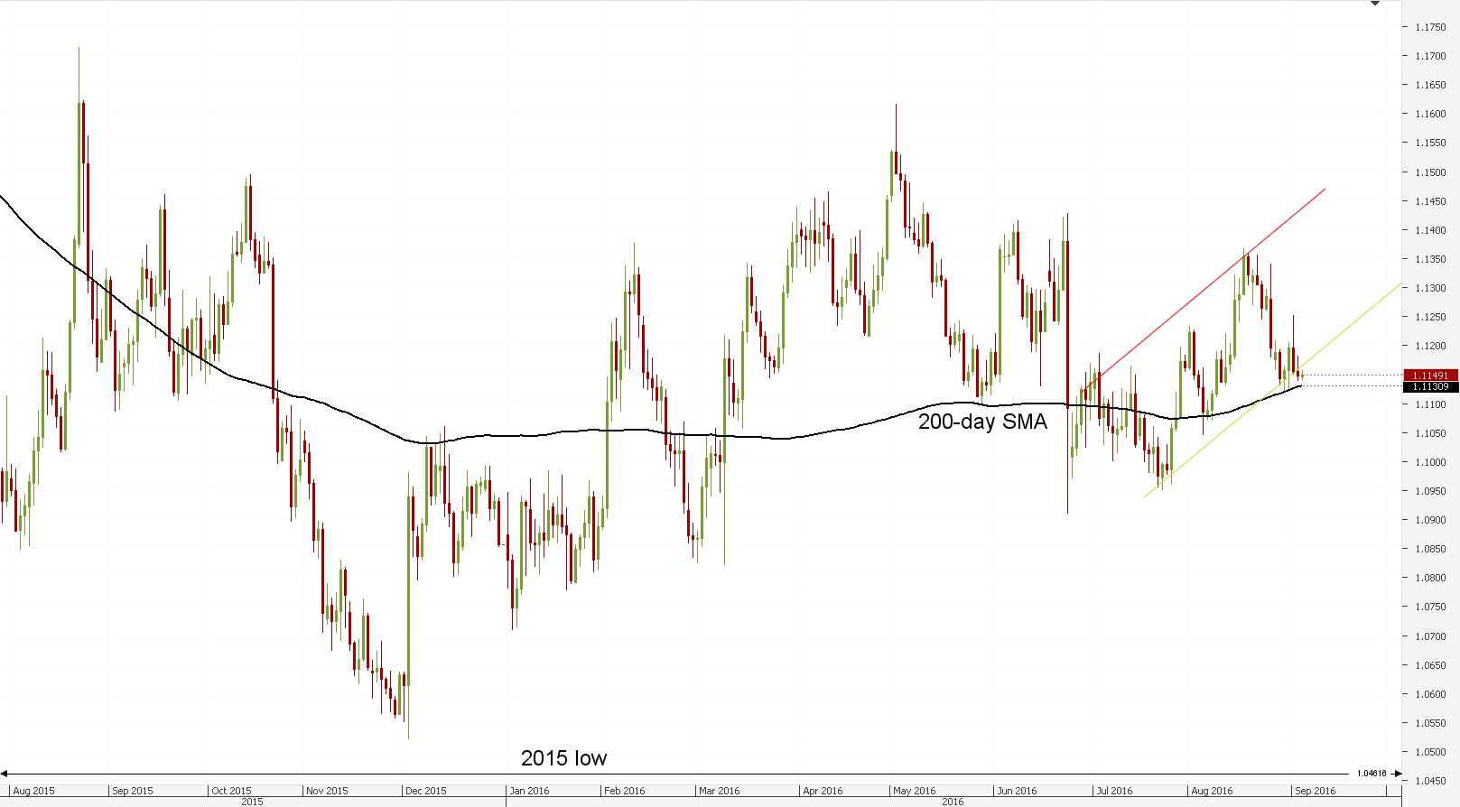 Daily chart: The common European currency traded almost flat on Tuesday morning against the US Dollar. Previously, the currency exchange rate moved lower on Monday, as it moved out of the channel upward pattern, which it started forming in the aftermath of Brexit. Although, it is likely that the rate will surge during today's trading session, as the 55 and 200-day simple moving averages are providing support just below it at 1.1141 and 1.1131. However, the rate would then be stopped by the resistance cluster located above from 1.1176 to 1.1190.Trader sentiment remains bearish