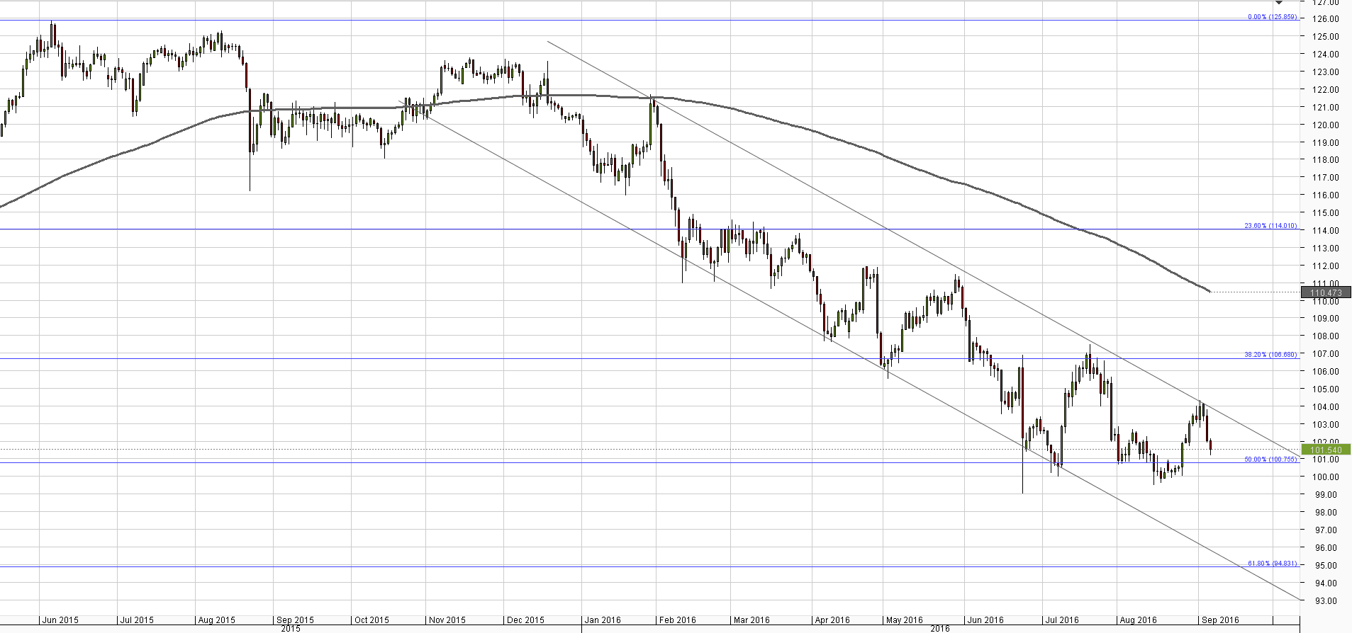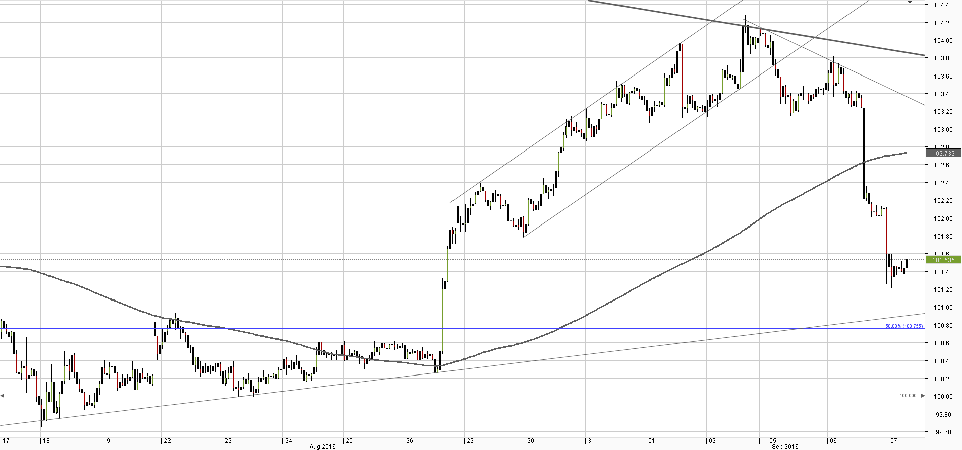 The bullish setup we mentioned in our previous reports is no longer topical. This is due to poor US data released yesterday, as a result of which the currency pair returned within the boundaries of the channel that has been forming since the last months of 2015. The immediate support is circa 101 yen, but the sell-off is likely to continue until we hit 100.70, where the monthly S1 coincides with 50% retracement of the 2012-2015 up-move. Current resistance is at 102.16, represented by the monthly pivot point.Daily chart