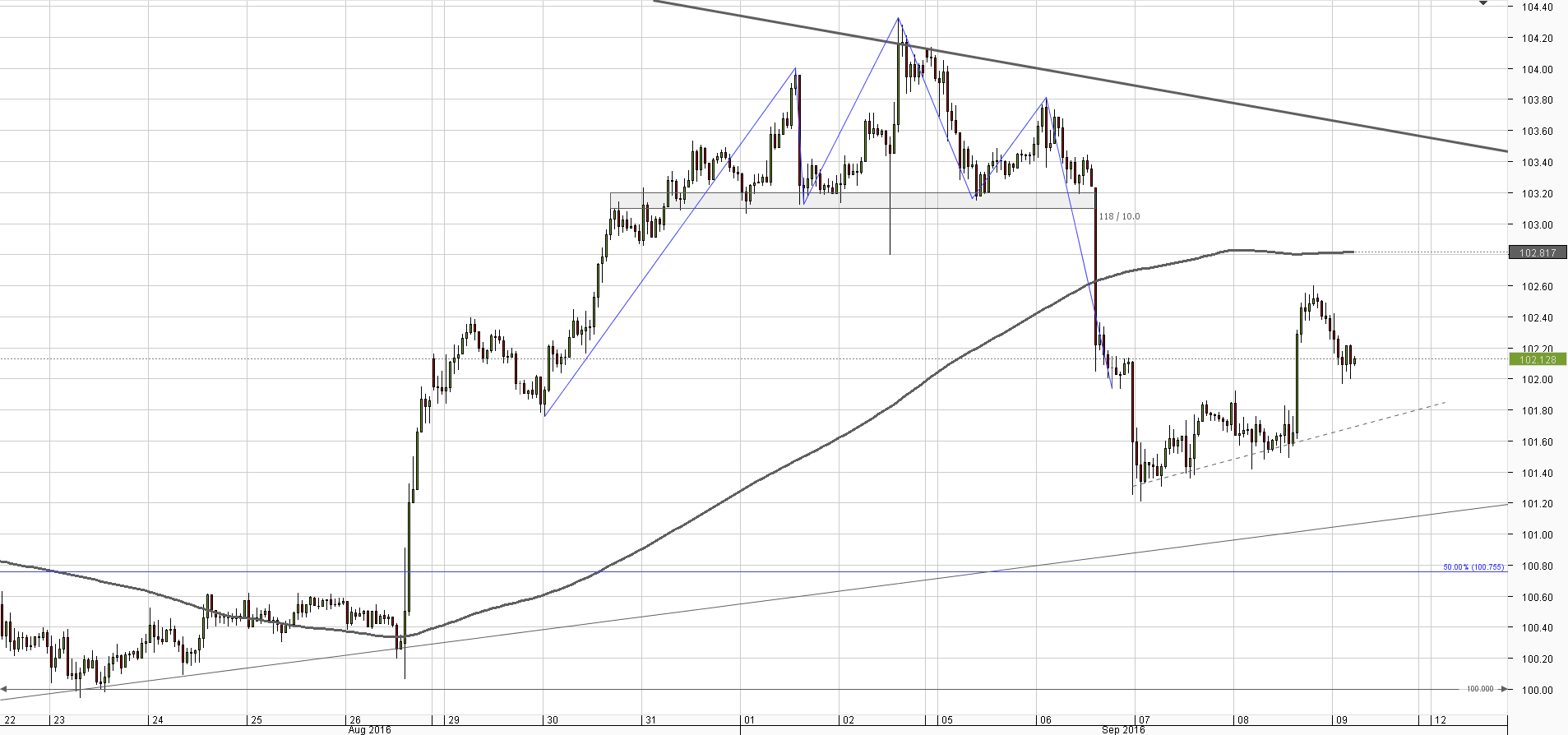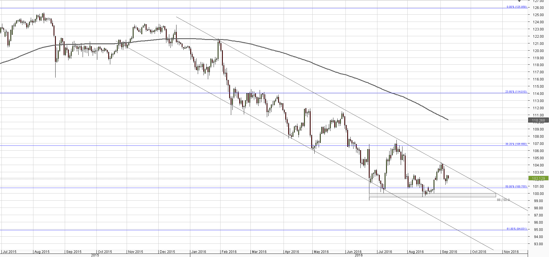 Although yesterday in the morning the upside seemed limited, the price managed to mount 102 yen, thus closing above the monthly PP and alleviating some downward pressure. Nevertheless, the 55-day SMA stays intact, suggesting the near-term outlook remains negative and 100.80/70 is still a viable target. This support mainly consists of the 50% retracement of the 2012-2015 rally and monthly S1. Additional strong demand is seen at 100 yen, and for the time being this we consider to be the floor.Daily chart