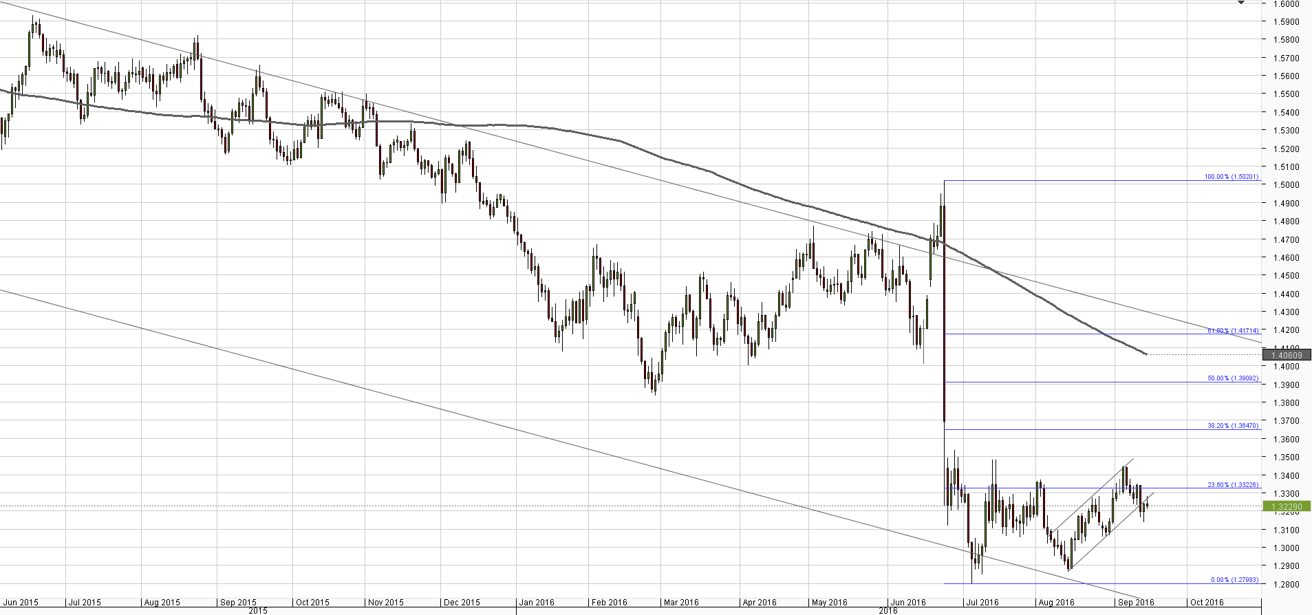 GBP/USD is currently pulling back after the pair broke out of the bullish channel to the downside. The gains from the monthly pivot point at 1.3126 that acted as a strong support area yesterday should be limited by 1.3320, where supply is implied by the weekly PP, 23.6% retracement of the ‘Brexit' sell-off and the lower bound of the channel that originated in mid-August. Once the ceiling is confirmed, the price should revisit yesterday's low and then extend the decline towards 1.29, which is the location of the monthly S1 and August low.