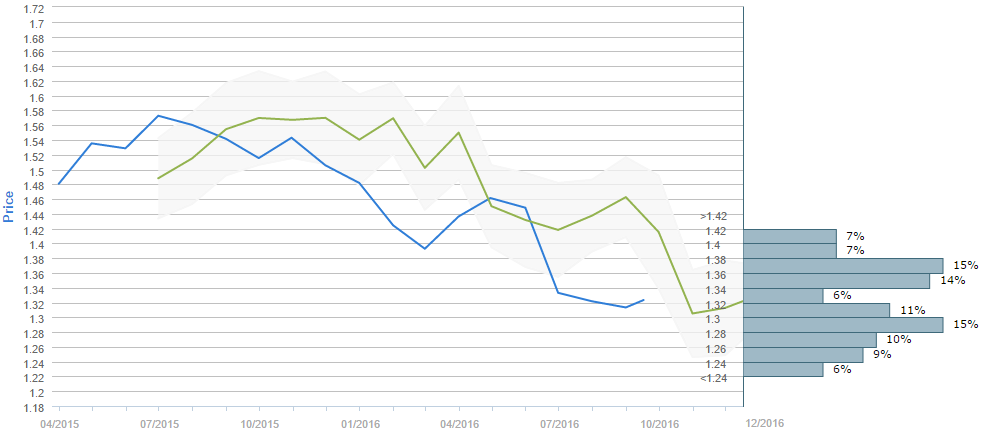 By the end of the next three months traders expect the Cable to be more or less at the same level where it is now. While the current price is 1.3230, the average forecast for December 16 is 1.3220. Interestingly enough, however, the 1.32-1.34 interval is the least popular along with <1.24, having only 6% of the votes each. Most of the votes are concentrated in 1.36-1.38 (15%), 1.28-1.30 (15%) and 1.34-1.36 (14%) intervals.