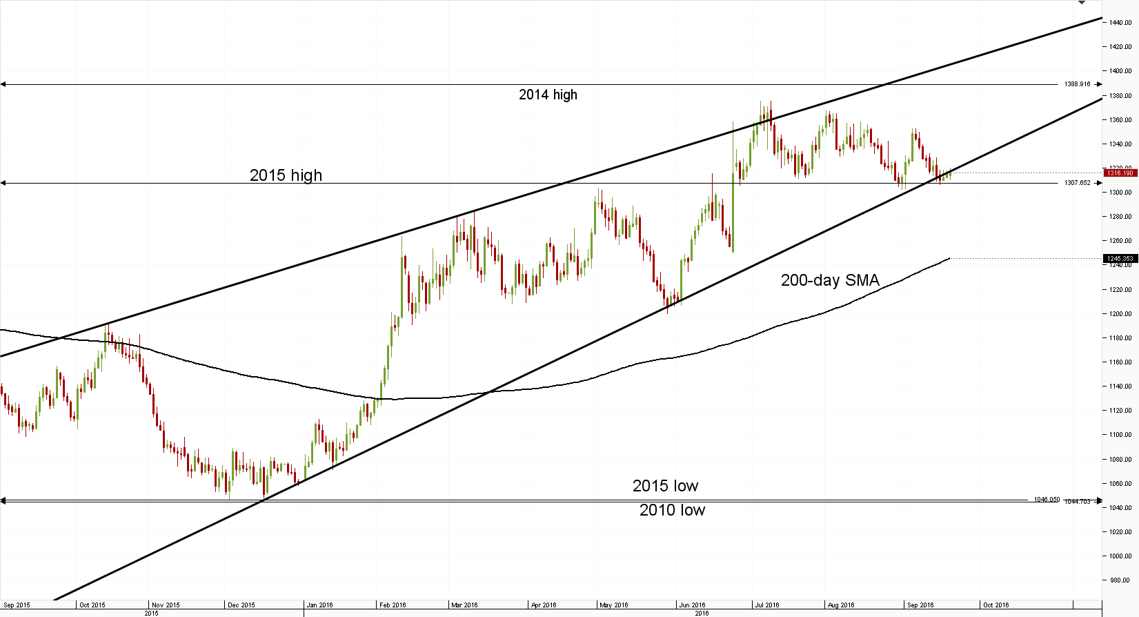- Gold reached a rising wedge pattern's lower trend line on Thursday