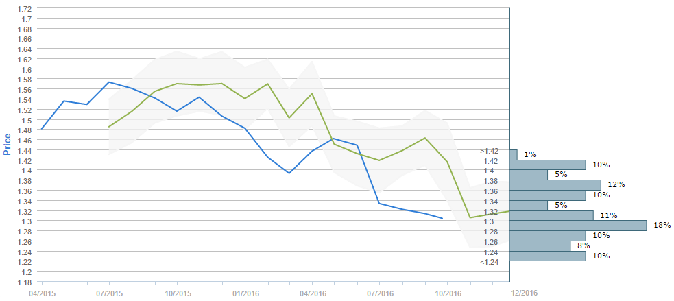 By the end of the next three months traders expect the Cable to be more or less at the same level where it is now. While the current price is around 1.30, the average forecast for December 23 is 1.3179. Interestingly enough, however, the 1.30-1.32 interval is not the most popular one, having only 11% of the votes. Most of the votes are concentrated in 1.28-1.30 (18%) and 1.36-1.38 (12%) intervals. Furthermore, 54% all survey participants believe the Cable is to remain above 1.30.