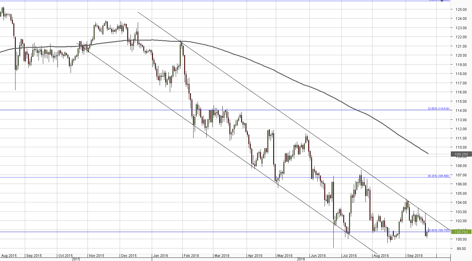 - The weekly S2 and the Bollinger band form support around 100.45
