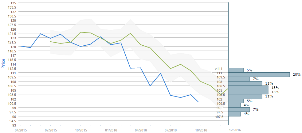 According to the poll that gathered forecasts between August 23 and September 23, traders expect the US Dollar to appreciate to 105.50 yen in three months' time, while the forecast for November 30 was only 103.30 yen. It is also worth noticing that 80% of all forecasts fall above 102 yen, which is the current spot price. By far the most popular interval is 109.50-111.00, chosen by 20% of all the surveyed, compared to popularity of the 102.00-103.50, 103.50-105.00, 105.00-106.50 and 106.50-108.00 intervals.