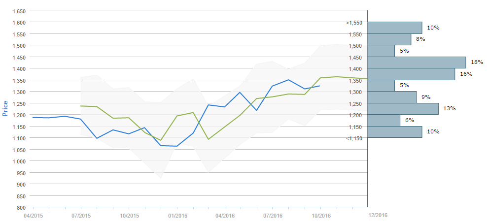 Traders who were asked regarding their longer-term views on gold between August 28 and September 28 expect, on average, to see the metal around 1,350 by the end of December. Generally, 57% (-1%) of participants believe the price will be above 1,350 in ninety days. Alongside, 27% (+1%) of those surveyed reckon the price will trade in the range between 1,200 and 1,350 over the next three months