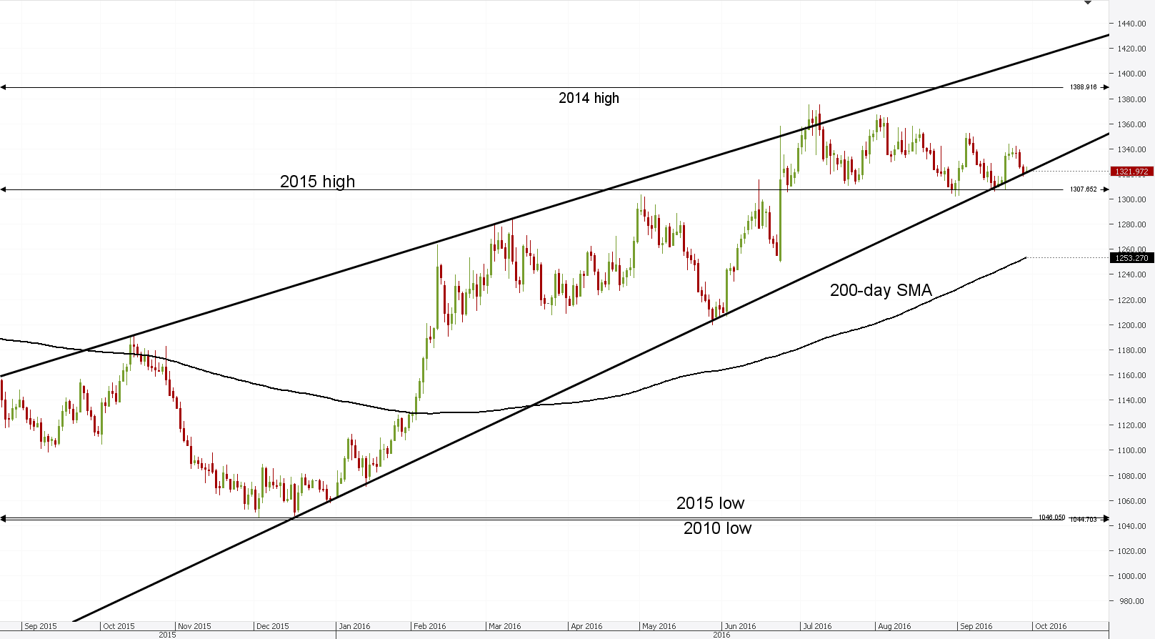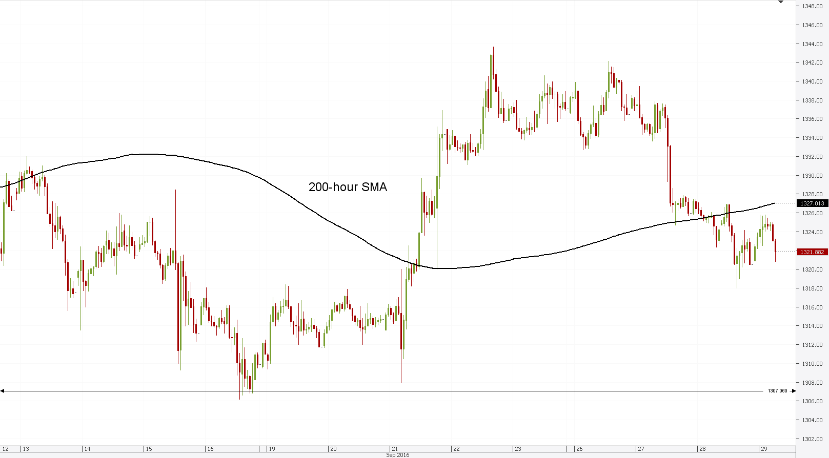 Hourly chart: The hourly chart for gold shows that the yellow metal reached the monthly pivot point at 11:00 GMT, and the metal fell afterwards to reach the rising wedge pattern's lower trend line around the time from 14:00 GMT to 15:00 GMT. At the pattern's lower trend line the bullion changed its direction and surged. During the sub sequential surge the metal had been hindered by the 20-hour SMA.
