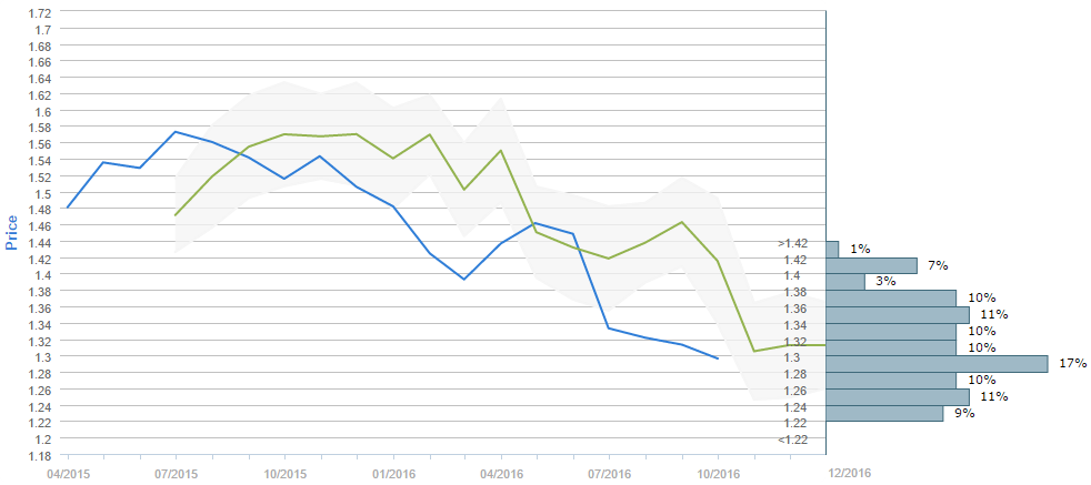 By the end of the next three months traders expect the Cable to be more or less at the same level where it is now. While the current price is around 1.30, the average forecast for December 30 is 1.3126. Interestingly enough, however, the 1.30-1.32 interval is not the most popular one, having only 10% of the votes. Most of the votes are concentrated in 1.28-1.30 (17%) intervals. Furthermore, 52% all survey participants believe the Cable is to remain above 1.30.