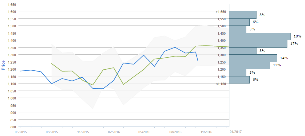 Traders who were asked regarding their longer-term views on gold between September 7 and October 7 expect, on average, to see the metal around 1,350 by January. Generally, 54% of participants believe the price will be above 1,350 in ninety days. Alongside, 34% (+1%) of those surveyed reckon the price will trade in the range between 1,200 and 1,350 over the next three months