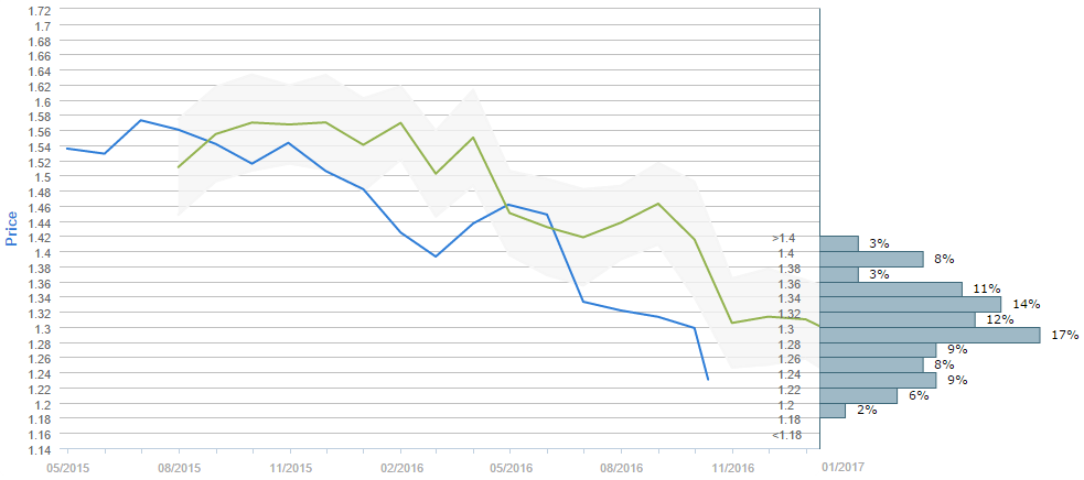 By the end of the next three months traders expect the Cable to be higher than the level where it is now. While the current price is around 1.23, the average forecast for January 11 is 1.3012. Interestingly enough, however, the 1.30-1.32 interval is not the most popular one, having only 12% of the votes. Most of the votes are concentrated in 1.28-1.30 (17%) interval, followed by the 1.32-1.34 price range with 14% of the votes. Furthermore, 51% all survey participants believe the Cable is to climb over 1.30.