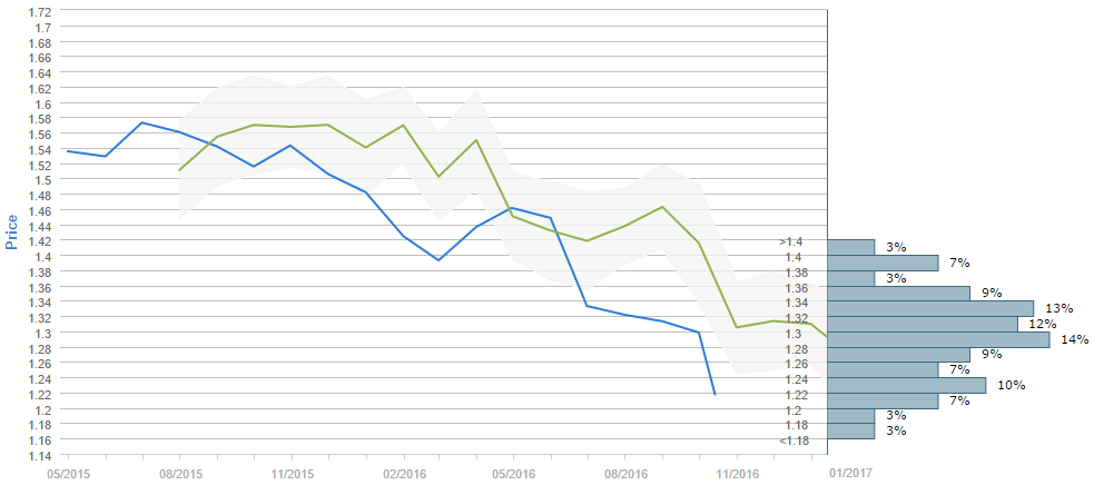 By the end of the next three months traders expect the Cable to be higher than the level where it is now. While the current price is around 1.23, the average forecast for January 13 is 1.2929. Furthermore, the 1.28-1.30 interval is now the most popular one, having 14% of the votes. On the second place in terms of the votes is the 1.32-1.34 (13%) interval, followed by the 1.30-1.32 price range with 12% of the votes each. Moreover, 53% all survey participants believe the Cable is to fall under 1.30.