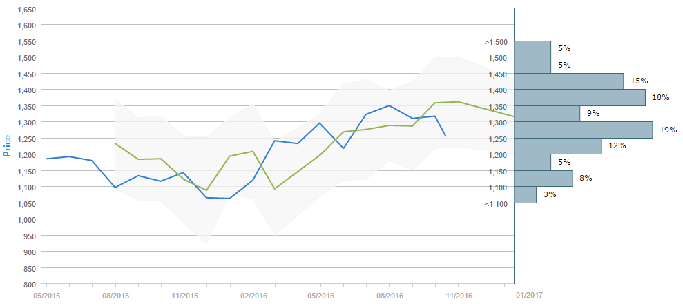 Traders who were asked regarding their longer-term views on gold between September 14 and October 14 expect, on average, to see the metal below 1,350 by January. Generally, 43% (-3%) of participants believe the price will be above 1,350 in ninety days. Alongside, 40% of those surveyed reckon the price will trade in the range between 1,200 and 1,350 over the next three months