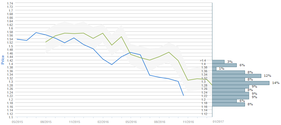 By the end of the next three months traders expect the Cable to be higher than the level where it is now. While the current price is around 1.23, the average forecast for January 17 is 1.2782. Furthermore, the 1.28-1.30 interval is now the most popular one, having 14% of the votes. On the second place in terms of the votes is the 1.32-1.34 (12%) interval, followed by the 1.20-1.22, 1.22-1.24 and the 1.30-1.32 price ranges with 9% of the votes each. Moreover, 63% all survey participants believe the Cable is to fall under 1.30.