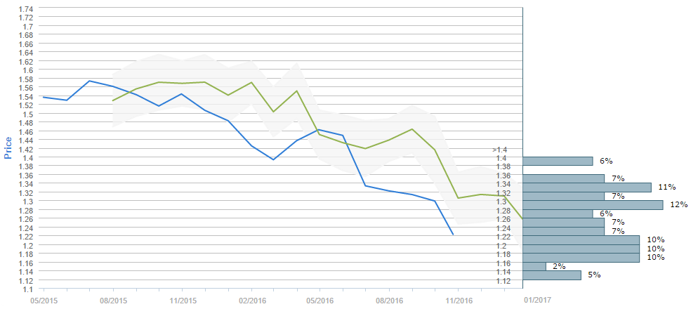 By the end of the next three months traders expect the Cable to be higher than the level where it is now. While the current price is around 1.23, the average forecast for January 24 is 1.2577. Furthermore, the 1.28-1.30 interval is now the most popular one, having 12% of the votes. On the second place in terms of the votes is the 1.32-1.34 (11%) interval, followed by the 1.16-1.18, 1.18-1.20 and 1.20-1.22 price ranges with 10% of the votes each. Moreover, 69% all survey participants believe the Cable is to fall under 1.30.
