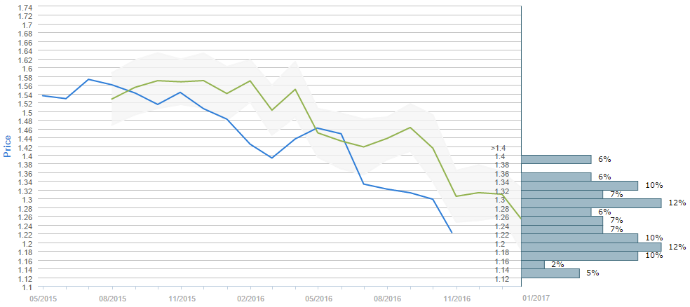 By the end of the next three months traders expect the Cable to be higher than the level where it is now. While the current price is around 1.23, the average forecast for January 25 is 1.2541. Furthermore, the 1.18-1.20 and the 1.28-1.30 intervals are now the most popular ones, having 12% of the votes each. On the second place in terms of the votes are the 1.16-1.18 (10%), 1.20-1.22 (10%) and the 1.32-1.34 (10%) intervals. Moreover, 71% all survey participants believe the Cable is to fall under 1.30.