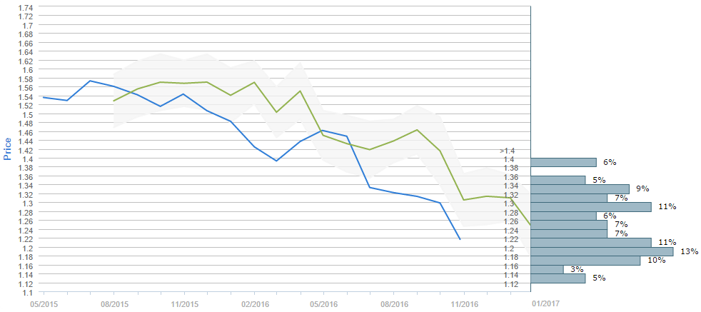 By the end of the next three months traders expect the Cable to be higher than the level where it is now. While the current price is around 1.23, the average forecast for January 26 is 1.2491. Furthermore, the 1.18-1.20 interval is now the most popular one, having 13% of the votes each. On the second place in terms of the votes are the 1.20-1.22 (11%) and the 1.28-1.30 (11%) intervals, followed also by the 1.16-18, with 10% of the votes. Moreover, 73% all survey participants believe the Cable is to fall under 1.30.
