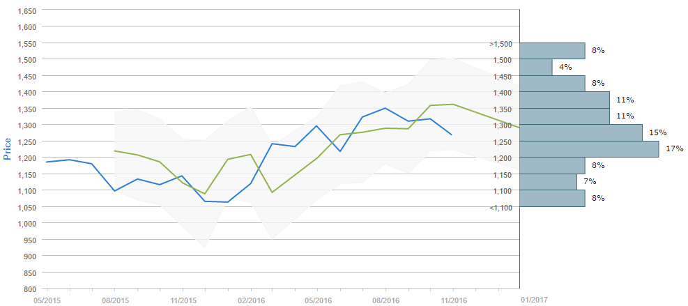 Traders who were asked regarding their longer-term views on gold between September 28 and October 28 expect, on average, to see the metal below 1,300 in January. Generally, 42% (-3%) of participants believe the price will be above 1,300 in ninety days. Alongside, 40% (-1%) of those surveyed reckon the price will trade in the range between 1,150 and 1,300 over the next three months.